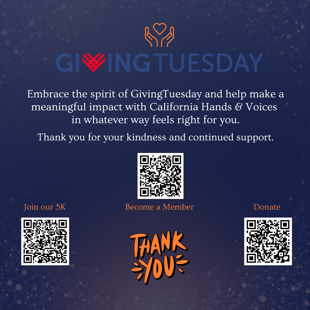 It’s not too late to support California Hands & Voices this #GivingTuesday. We know there are countless worthwhile nonprofits doing incredible work, and we’re truly honored to be among those you consider. Every donation—no matter the size—makes a meaningful impact for families across California.